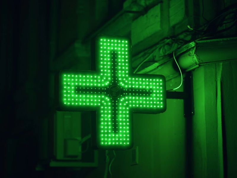 Banderolas con la icónica cruz verde o diseños médicos, ideales para identificar claramente establecimientos farmacéuticos.